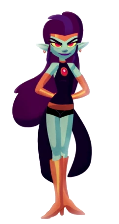 Ela possui a pele esverdeada. Seu cabelo se estende até um pouco abaixo de sua cintura e de coloração vinho com uma mecha roxa no topo do seu cabelo. Suas orelhas são semelhantes as de duendes e ela tem olhos vermelhos e boca de cor vinho, mas mesmo assim ela é lindaaaa!